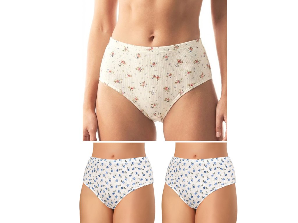 Dámské kalhotky "babkáče" s motivem květin a rýhovaným vzorem (rip) jsou z kvalitní bavlny, která je velmi příjemná na dotek. Jejich obliba stoupá přímo úměrně se zralostí nositelky.