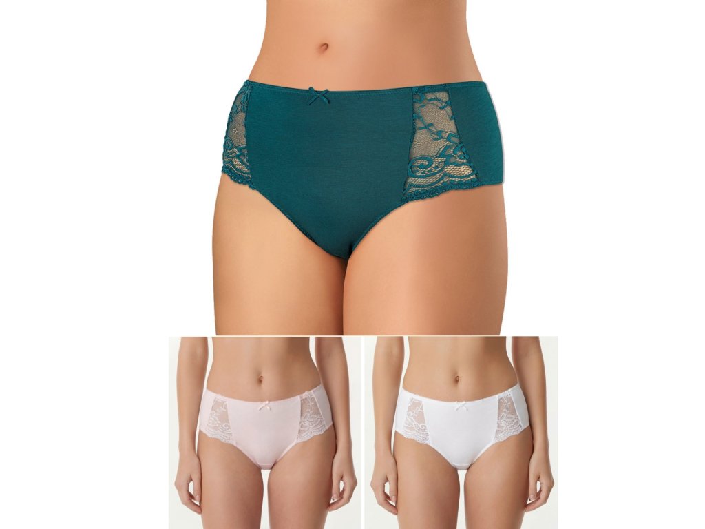 Sada 3 ks (bílá, růžová, tyrkysová) dámských vyšších kalhotek s vysokým podílem bavlny. Zadní díl je z hladkého materiálu. Složení: 58% bavlna, 36% polyamid, 6% elastan.