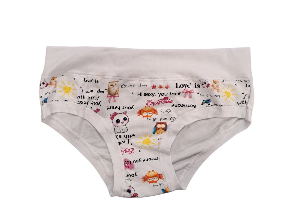 Dívčí kalhotky Emy Bimba zdobené roztomilými obrázky, bavlněné s plochými lemy a bez gumiček, velmi pohodlné, od 2 do 15 let