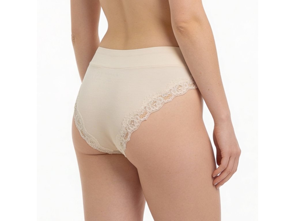 Krásné dámské brazilky značky Syvela ve světle tělové barvě s ozdobnou krajkou na zadním lemu. S vyšším sedem a výraznějším vykrojením poskytují mimořádné pohodlí. Ploché lemy se nezařezávají do kůže, což zvyšuje komfort nošení. Modalový materiál svou hladkostí a jemností připomíná hedvábí, zatímco lehká příměs elastanu zajišťuje skvělou pružnost a perfektní přizpůsobení tvaru postavy.